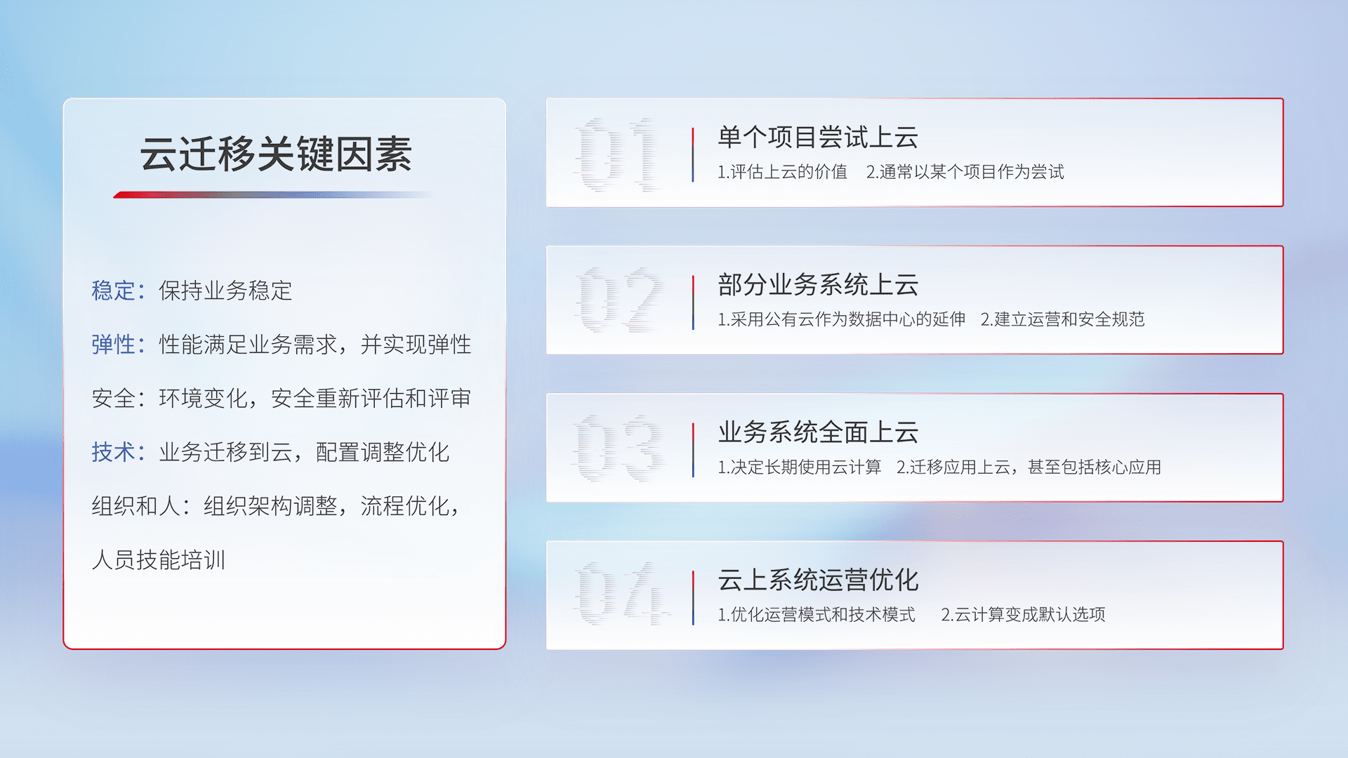 结合实际业务,,,从规划设计、、、云平台选型、、、、云原生改造、、、数据迁移、、、集成交付,,迁移全过程为客户识别最佳上云路径,,做好风险识别管理,,,,设计网络架构、、身份权限、、、、安全审计合规、、操作审计、、日志审计、、、监控告警策略、、、、多站点容灾设计等,,,对云上基础设施进行整体规划,,,提升IT治理水平,,,以满足弹性、、、、高可用、、、高性能的需求。。。。