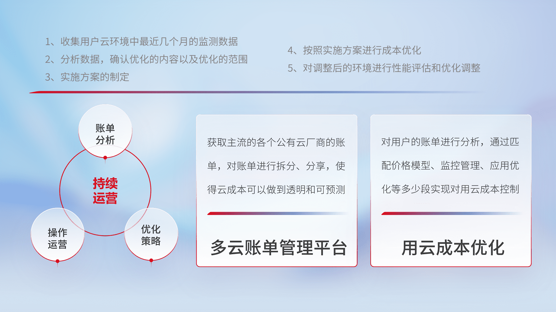 通过多云纳管,,以统一的资源数据模型把客户的云资源进行抽象和封装,,进而实现对多云资源的统一操作,,,,保障云资源管理的可靠性、、稳定性与可用性。。。。量身定制化运维内容,,,配置、、、、开发运维、、补丁管理、、备份、、、监控、、认证和访问管理、、、审计和日常巡检等,,,保障在用云过程中的可靠度,,稳定度以及高可用率。。。。